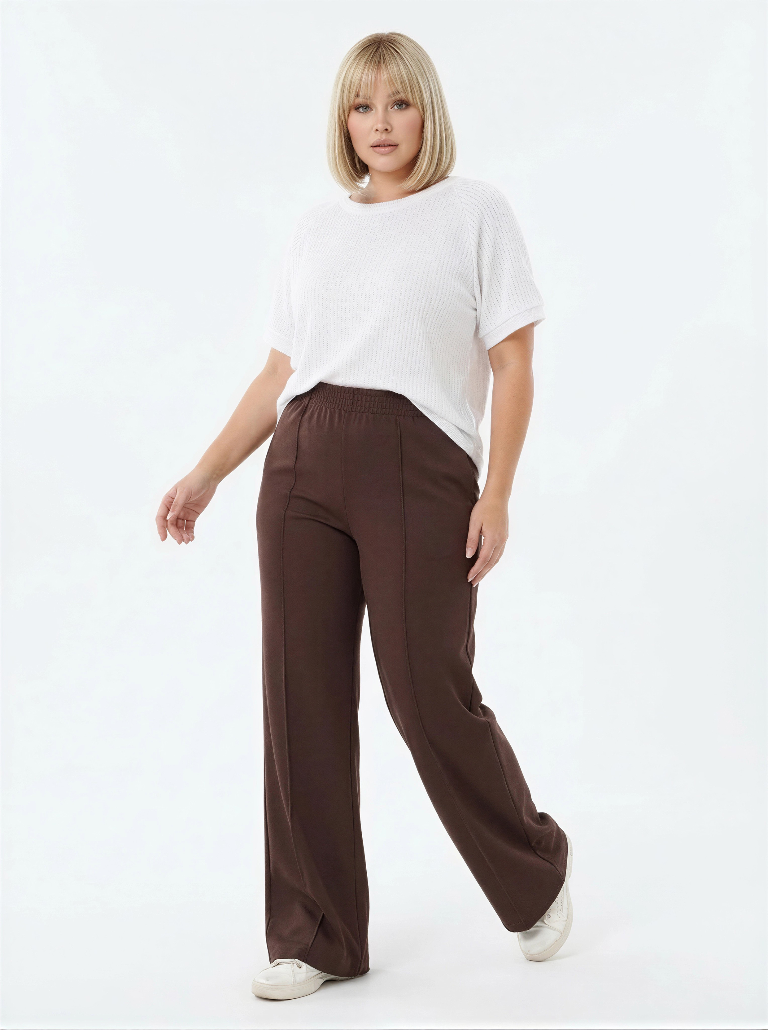 Свободная блузка с короткими рукавами выполнена из лёгкой трикотажной ткани с выразительной текстурой. Вырез горловины круглый, без застёжек. Рукава короткие, свободного кроя, без дополнительных деталей. По боковым швам отсутствуют разрезы, общий стиль минималистичный и комфортный.